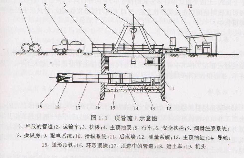 頂管施工就是借助主頂油缸及管道間的中繼間等的推力,把工具管或掘進(jìn)機(jī)從工作坑內(nèi)穿過土層一直推到接收坑內(nèi)后回收的過程。與此同時(shí),也就把緊隨工具管或掘進(jìn)機(jī)后的管道埋設(shè)在了兩坑之間,頂管施工示意圖如圖1.1所示。一個(gè)比較完整的頂管施工大體包括以下部分。