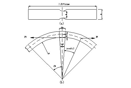 如圖8.6.2-1所示,設(shè)在測試時夾持面在試樣側(cè)面,其所受的使試樣產(chǎn)生拉伸的切向力是均布的,這樣可把夾持面的這種力簡化為一作用在試樣寬度和厚度中間層交線與圓心角(α-α0)的角平分線交點上的集中載荷,設(shè)該點載荷的大小為Ft。