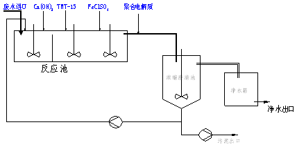 先在廢水中加入石灰乳或其它堿性化學試劑(如:NaOH等),將pH值調(diào)至6~7,為后續(xù)處理工藝環(huán)節(jié)創(chuàng)造良好的技術(shù)條件,同時在該環(huán)節(jié)可以有效去除氟化物(產(chǎn)品CaF2沉淀)和部分重金屬。然后加入石灰乳、有機硫和絮凝劑,將pH升至8~9,使重金屬以氫氧化物和硫化物的形式沉淀。
